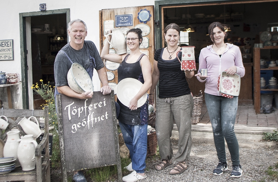 In unserer Töpferei stellen Meister, Gesellen und Lehrlinge hochwertiges, hand-gemachtes Gebrauchsgeschirr, dekorative Einzelstücke und Gartenkeramik her. Die Handarbeit ist das Markenzeichen unserer Töpferei, und macht jedes Stück zu einem kleinen Einzelstück. Jede Tasse, jeder Krug & jede Schale wird einzeln auf der Töpferscheibe gedreht und mit Engoben von Hand bemalt.